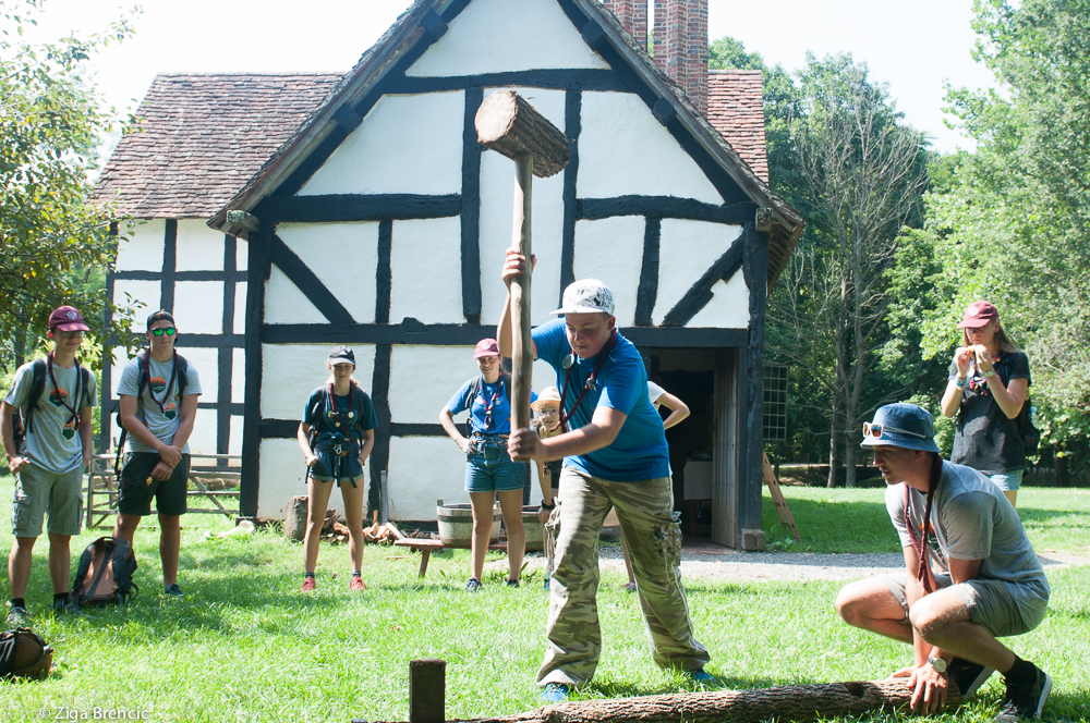 We changed our morning routine a bit and started with a morning exercise. After we packed up the bus drove us to the historic village. Where we had a tour of different cultures during the last few hundred years. We learned how they were cutting logs back at the day:And how they made nails:Next was a visit of Walmart. It's kind of must stop if one wants to get a proper American experience. Once we stocked ourselves with chips, cookies and other American junk food we drove to a park in Staunton and eat our dinner. Pizza, ice-cream and watermelon. Big thank you to our hosts Bob and Joanne for the organisation. At 19:30 we headed to a stadium to see a baseball game. Between Staunton Braves and Winchester Royals. Marko one of our scouts had the honour to throw the opening ball.We filled up the stadium. Players were a bit surprised to have such a big audience at a local game.Apparently at a baseball game its a custom to have a baseball cap and turn your cap based on how your team is doing. If the shield of the baseball cap is in front your team is wining and if it's turned around your team is losing. Sort of silent cheering.Our team (home team) Staunton Braves lost lost 7-2. But the whole experience was wonderful so no complaints here. At 22:00 we drove back to Blue ridge took a shower and went straight to bed. Oh and our bus died on our way back. Nothing major. Bus driver fixed a problem in a few minutes.