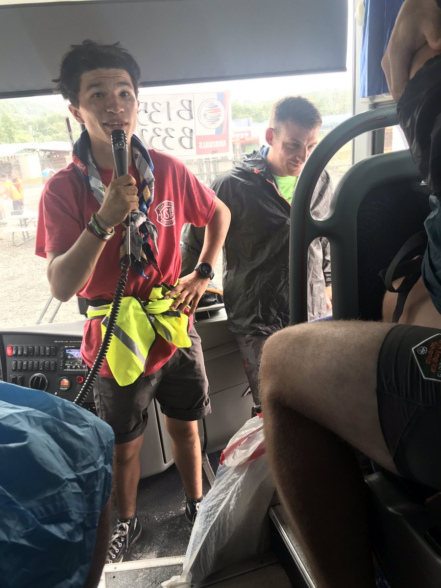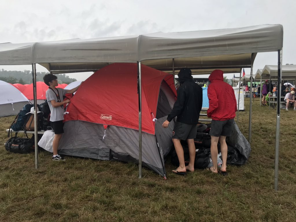 Alright let's get to the Jamboree. We packed up and embarked the buses for our last 3h of drive to the Jamboree site. When we arrived to Jamboree we were almost quarantined due to miscommunication. Luckily everything turned out fine π We received a warm welcome and a lot of instructions how to set up the tents. Have to admit Americans organised the hole thing pretty well:Since it was raining we had to set up a tent assembly line:After the tents were up we headed to the shop. Yeah luckily there was a friendly lady who helped us out. Shop was pretty chaotic but we managed to get everything we needed. During the dinner it started to rain as hell. So we played the guitar and eat a whole plate of brownies. Then one of the Bravo sub camp leaders came by and asked us if we could help to setup the tents for a unit that was about to arrive in the middle of the night. So patrols from three different countries came together and in 30 min 20 tents were up. Collaboration at the peak. Hey my name is ... from ... let's set up a tent. We wrapped the day with a group meeting with all 20 of us and went to bed at 22:30. Next morning we start with the big zip-line and coffee.