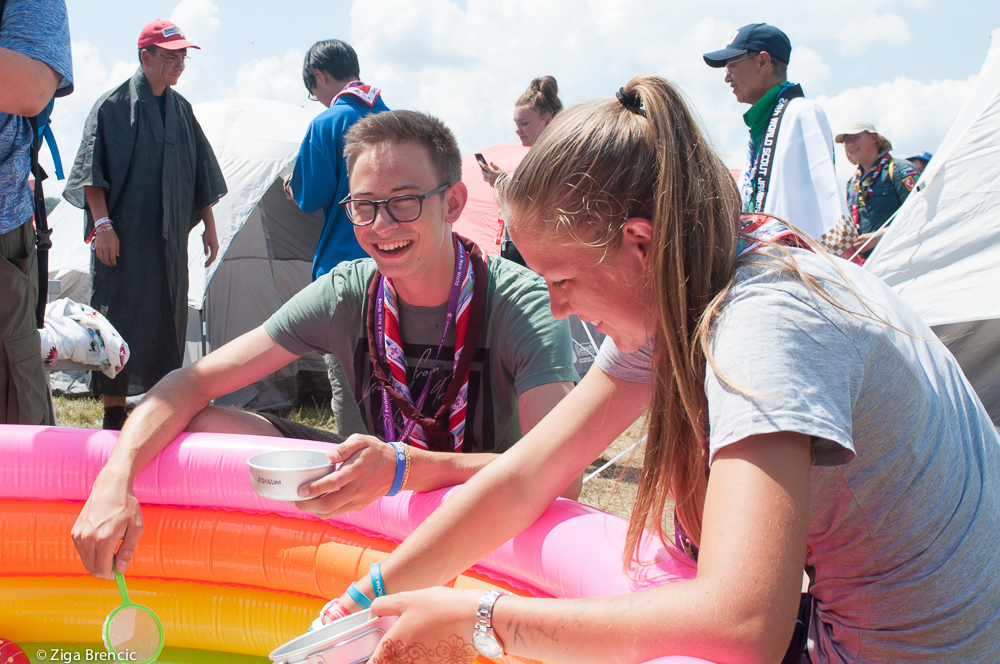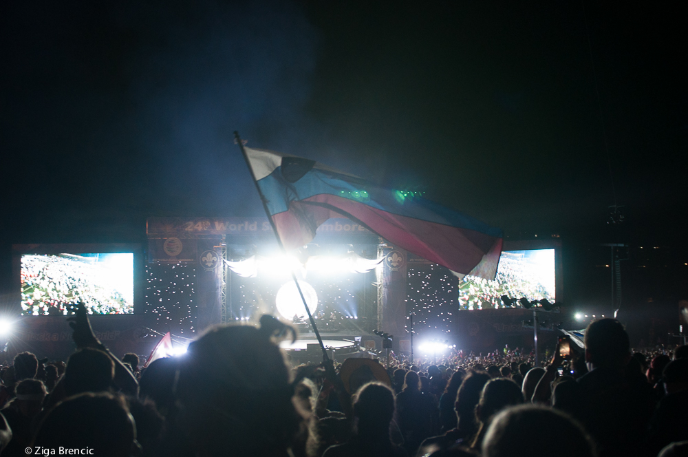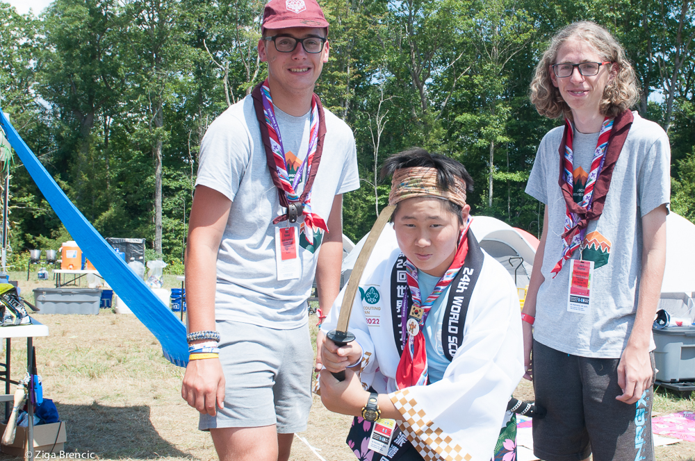 We woke up at 7:30 and eat breakfast. I dared to skip the ice cold shower. The preparation of food for the culture day followed. At around 10 o'clock I went around the camp with Laura and Neza to see what other countries prepared for the cultural day. Paraguay unit was showing traditional dances, Italians made a pizza using tortillas. We briefly stopped at the Croatian place to ketch up. Japanese again made a whole show. We learned how to make a proper green tea. How to fish up small balls using a sheet of thin paper. I received a small pickachu for my efforts at the pool:Photo shoot with a samurai:I stopped for some Swiss pasta made out of onions, cheese and apple sauce. Then we headed to the Alpha camp site stage for the presentation of Slovenia. Participants had to improvise to execute the whole presentation but they did an amazing job. Nika, Domen, Bor and Katalena managed to coordinate all of the 140 Slovenian participants in half an hour and pulled off an amazing show. Thumbs up guys.Then we ran from the hot sun back to our sub camp to chat with Slovenian Jamboree Staff members IST. It's so cool to hear stories of what's happening to others over a cup of Slovenian coffee. After a lot of laughing the IST picked the food we bought for them and left. Dinner followed, American pancakes this time.Next was a Slovenian contingent photo shoot in front of the Summit Sign:And my patrol. With first photo of me from the Jamboree. OK first good one 😛 that isn't a selfie:Followed by a cultural day ceremony. Organisers brought some singers from Broadway that sang songs from Disney movies. Pretty cool though the start of the ceremony was boring as hell. One hour of talking. Really? Today I tested my photo pass that allows me to go inaccessible places. Once I came below the stage another photographer started to shadow my shots 🙂 As I made a photo and moved forward he repeated the shot. Like 4 or 5 times. Copy cats ...We finished the ceremony by singing the Country Roads in 180 languages then headed to our sub camps. The whole moving process of 50.000 people was better coordinated this time then at the opening ceremony. Bridge was still shaking though 😂 Day was wrapped up by a short meeting of our troop where we planed out the next day. Our participants are getting pretty independent. They prepare breakfast, check in during the day, go shopping, prepare diner. Pretty cool to be a leader of such group 🙂