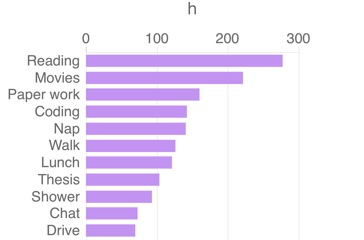 Then when I came back home to Slovenia, I fell a bit of the cliff. I was still minimizing, but I realized that certain areas were still untouched. From 2018-10-05 till 2019-05-25, I started monitoring my time in 15 min slots. I spent 1933 hours sleeping (on average 8.3 h a day) and doing mostly the following:Above are just the most represented activities. I noticed that I spent way to much time in movies and social media, and barely any time socializing. So few drastic changes followed. I started minimizing social media. But to escape from the hamster wheel, I had to block: YouTube, Facebook, IMDb, Twitter, Netflix, HBO ... So now if I try to access any of those web sites I get: Can't connect to the serverAs a result, I suddenly had a lot of time to read. So nowadays I finish 1 - 2 books a week. More how I got there in Movie addiction . For the geeky Mac audience. Use some terminal magic to block a specific web page. Add the page to /etc/hosts with: