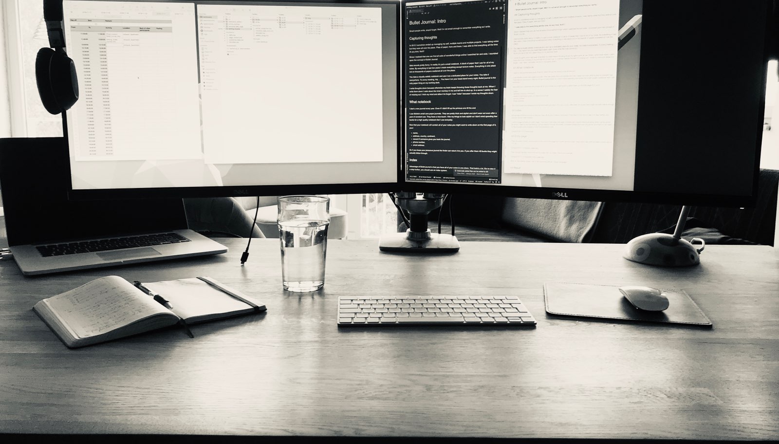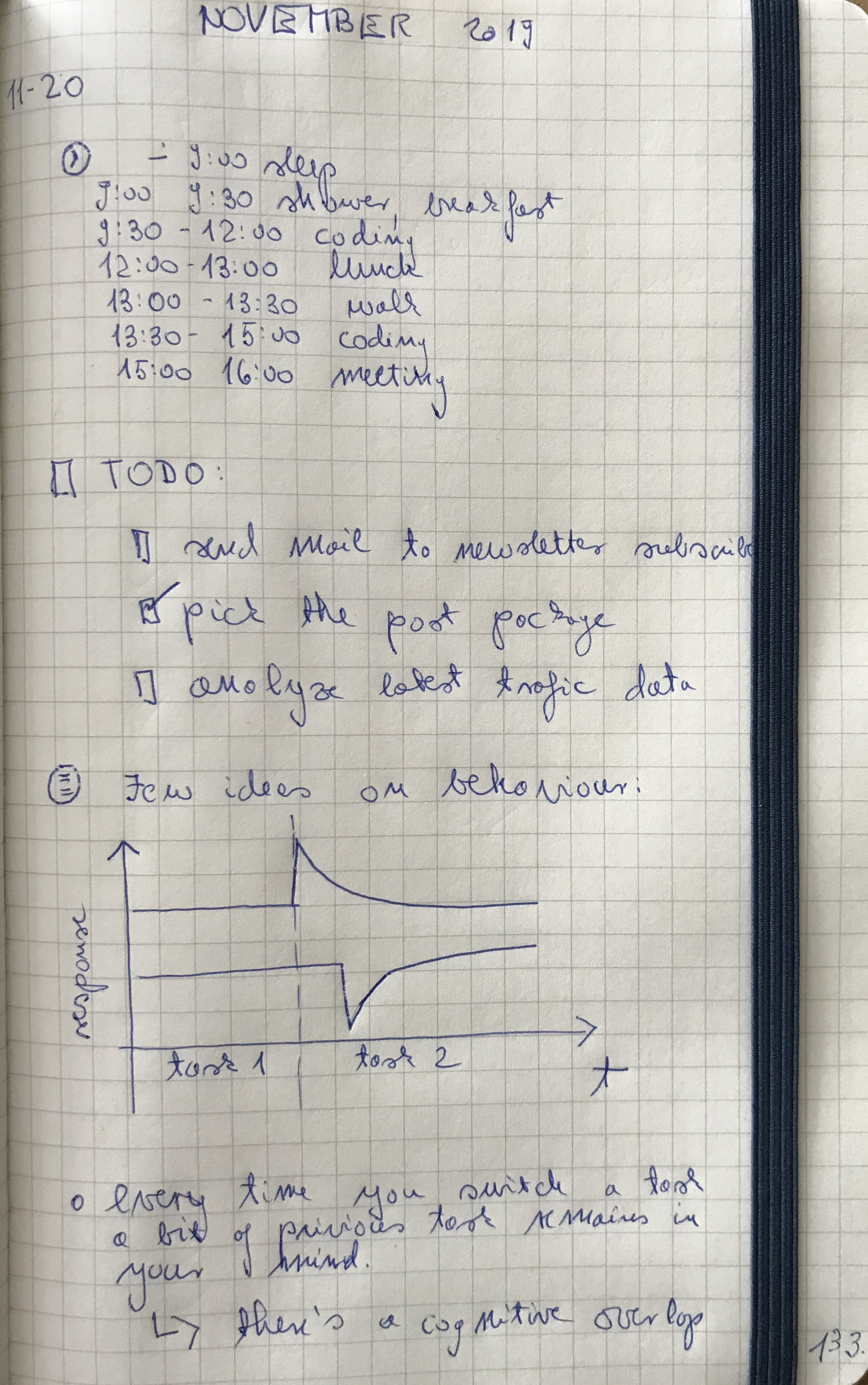 In 2015 I somehow ended up managing my self, multiple teams, and numerous projects. I was taking notes, but they were all over the place. Piles of paper, here and there. I was able to find everything all the time. At any time. Not!!! At some point, I stumbled upon the concept of Bullet Journaling. The idea sounds pretty fancy. In reality, it's just a small notebook that you use for all the notes. Everything in one place not on thousands of papers scattered all over the place.You take a beautiful notebook and use it as a dedicated place for your notes. You take it everywhere. To every meeting, trip, ... You have it on your bead stand every night. Every time an idea pops up in your mind, you write it down. I write my thoughts because otherwise, my brain keeps throwing those thoughts back at me. When I write ideas down, I calm down the inner monkey in me. Telling him to shut up. In a sense, I satisfy the fear of missing out. I trick my mind and allow it to forget. I can "relax" because I wrote my thoughts down, and I can retrieve them at any point.Bullet Journal is the only thing on my working desk beside the computer. Since I spend most of my time writing code and articles, that's pretty much everything I need anyway. Distraction-free environment. As long as social media is blocked π