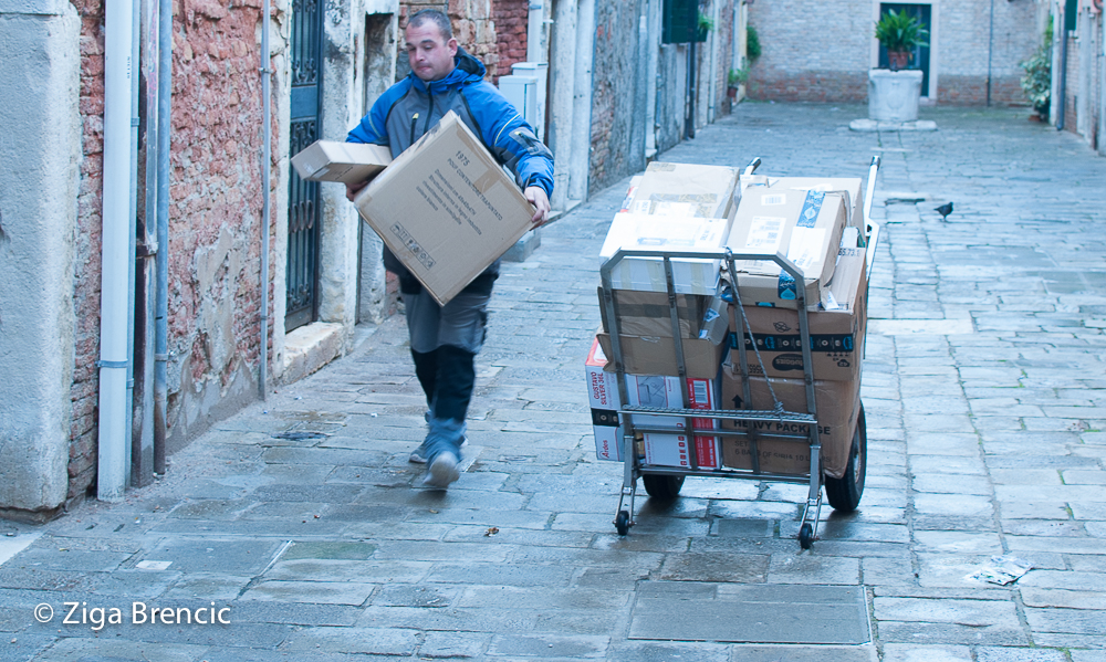 If you don't want to pay a fortune for the food, you better go to the outskirts of the city where the local's shop. There you can find typical grocery stores with human-friendly prices. When there observe a bit the life around you.In the morning on my way to the city center I bumped into this fine gentlemen:Post delivery in Venice. Yes by boat then by hand.Yes, he was delivering Amazone packages. Not by a van but by a trolly. Later on, I stumbled upon the boat that delivers the boxes around the city. The dispatchers then distribute packages around the city on foot. If you look carefully, you'll see that locals spend most of their mornings resupplying their shop/restaurant reserves. Street sellers are preparing their "original" female bags for selling in the back allies. Yup, the street seller, parked himself on the doorsteps of a cemetery. Then stuffed the "original" Guccy bags with the old paper. So they would have more volume. Look nicer.