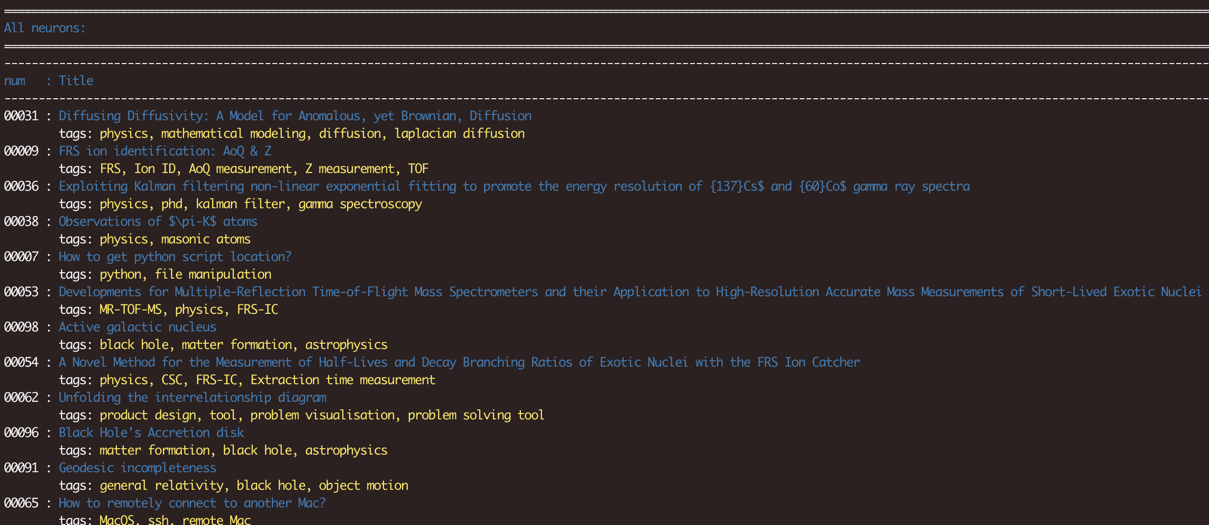 We forget stuff. Our brain is built out of neurons (so they say) and those neurons (solid points) form bits of our knowledge bank:If we don't use a neuron for a while, it slowly "dies out". It becomes less accessible to us (dotted point). We don't lose just a neuron we also lose all of the connections associated with it.The logical next step is then:How can we build a digital brain?After a few iterations, I came up with an approach that allows me to systematically build my knowledge bank out of small bits called neurons.Digital brain is a folder on my PC with the following structure: