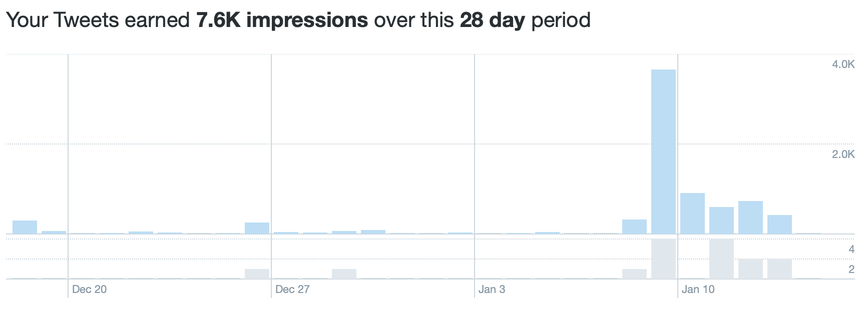 I also tried Medium in the past, but I didn't find the platform that appealing. So I'm starting with a small, practically non-existent audience. But you have to start at some point, right ๐My main focus for 2021 is for now Twitter. Once I polish that process of creating content for it regularly, I'll take a more serious dive into the SEO.Some of the Twitter efforts already paid off. A small win, but an essential first step.