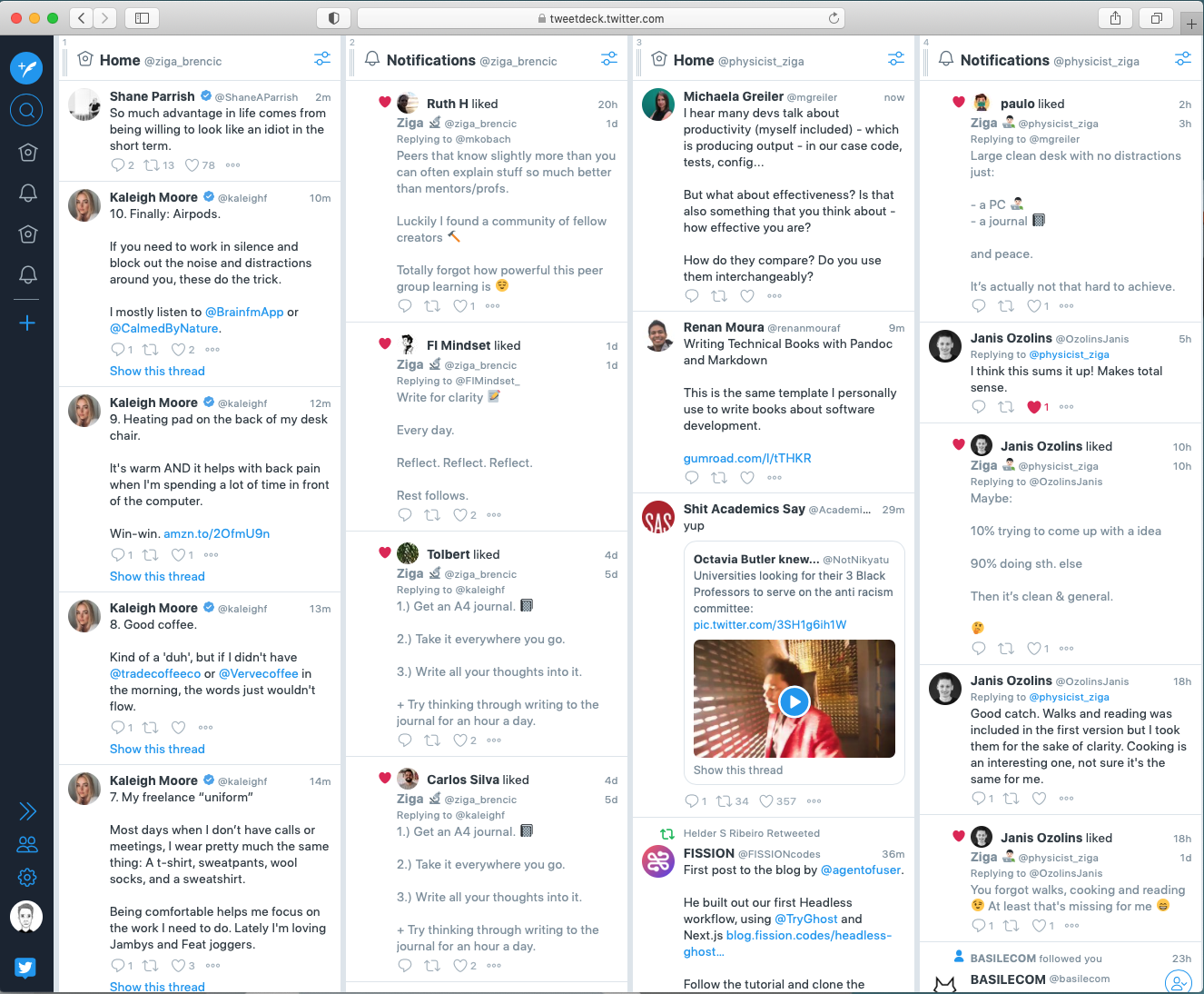 Both accounts will be about a single niche only. I also segmented the people I follow: tech people one account,lifestyle, business, marketing on the other account.Why two accounts? First, I'm interested in software, technology and personal development.Sure, there's a group of people interested in both if they are welcome to follow my online versions. The funny thing is that in real life, I'm part of the geek community and the "normal" community and people from both communities don't know each other. But I'm sitting in both πThere's another benefit. I'm exposed to two completely different audiences. One is saying:Growth hacking is dead.The other is saying:Growth hacking is the number one strategy for 2021.Guess which audience made which statement (tip: there are not many marketers in the tech world π ).As a result of the segmentation, I'm starting to see the whole personal brand picture more clearly. I am beginning to naturally sense the next moves to build a specific nicheβall the result of excellent segmentation.It's super easy to add/manage multiple accounts through Twitter clients. So no issue here.If I write what I did on marketing, life experimentation front every day to my journal, then writing the newsletter and marketing report weekly becomes a super easy task.