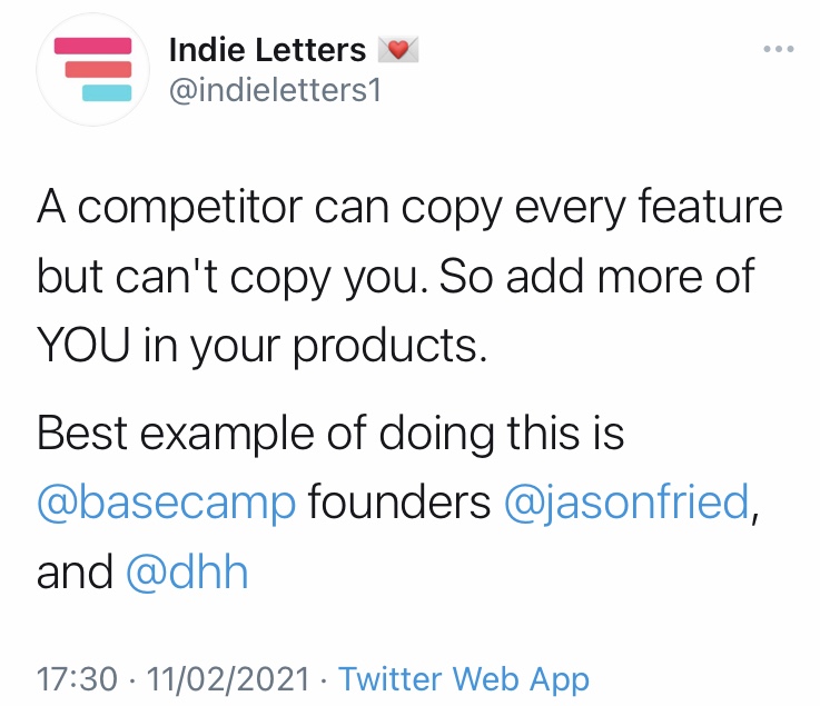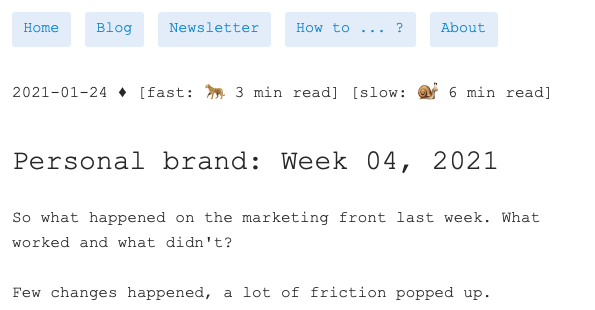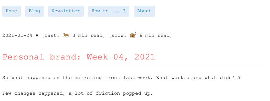 I might be improving my craft, but before I get to the pros' level, I'll need to invest in the craft lot more time.It's pretty frustrating because I see that I'm making progress. I'm clearing up many open questions, figuring out what to do, yet results: audience size, clicks, views, purchases are not going anywhere.They will. Eventually. At the moment, the payoffs are small. Like one like there, a comment, reply, observation from a reader, ...It sound's like nothing, but it's a lot because a year ago none of that existed. A new type of content that I could try out:And one more on the personal brand and why they are so appelaing:BTW I'm a big fan of Basecamp founders DHH and Jason Fried.