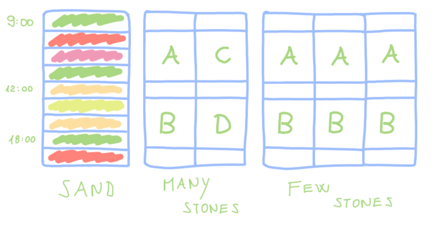 One of the main issues I'm fighting with is that I switch the context all the time. I wake up and for one hour write on productivity, then I start my research work and first do a bit of email, then I do a bit of article reading, then I do a bit of x, then y, then z, ...And before I switch the context, I usually spend an hour or two on the task. For example, today, I worked on one topic for four hours straight with just a few short water and bathroom breaks. I was super focused.But tomorrow, I'll probably get distracted by another work topic and work on that for four hours straight. Then Wednesday on something else. And on and on and on ...I guess you are familiar with the analogy: first, put the stones into the jar, then add the smaller rocks, then the sand. It's time management one o one:But we can end up with the schedule where we have large stones, but not the stones of the same type:I'm currently in the middle scenario. I do long work sessions, but from day to day, I switch context way too much. The ultimate goal is to fill your schedule with a few large stones of the same type over and over again.