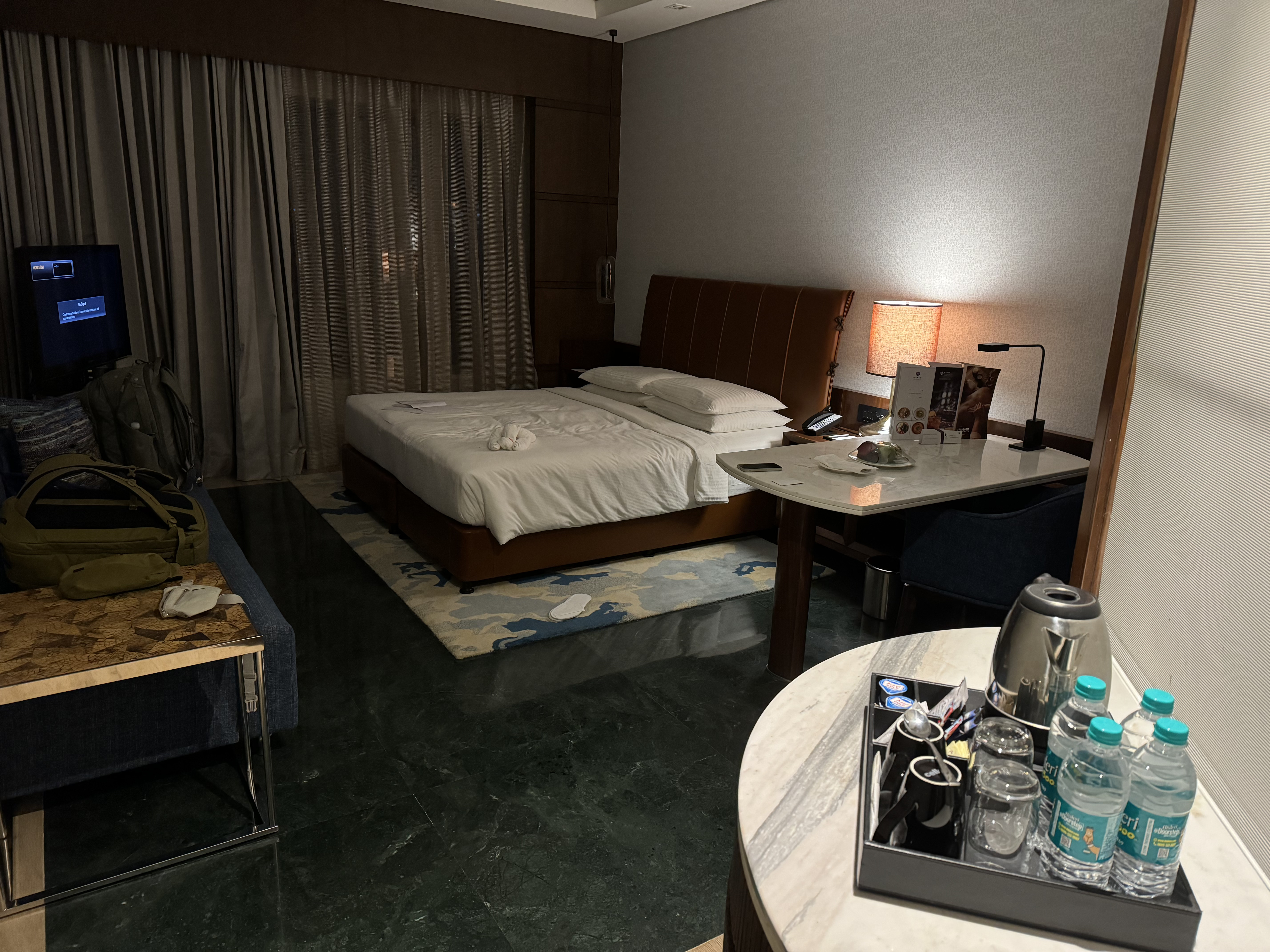 We were a bit puzzled about the last statement, but got to understand it pretty soon.[01:07] Nice car water bottles and newspaper. Drive to city.[01:15] Haha. The guy went between two lanes to get his way. Not our driver though[01:21] Ok some of the trucks look like they will fall apart. Yet drive tones of material. Or people. Girl at the back motor seat. No hands writing messages. This india trip will make for a good photo-shoot.[01:31] At hotel. Crazy security. Apparently standard for buildings like this. Or so they say.[01:32] At reception. Dudes are moving sofas at 2 o'clock in the morning. An unpleasant flash back to my trip in London in September 2023, when there was no furniture in my room when I came back home at 2 in the morning.[01:35] We had to take a photo at reception with some lady with India style welcome.[01:45] At our room. Will do for the first two days:[02:18] Ok lets see if we get to bed before 03:00. So 23:00 Slovenian time.[02:25] Shower[02:35] Dinner we brought with us.[02:45] Brush teeth with bottled water. Took probiotics.[02:52] Trying to sleep[04:00] Fell a sleep. Woke up several times throughout the night. Jet leg is a bit annoying.